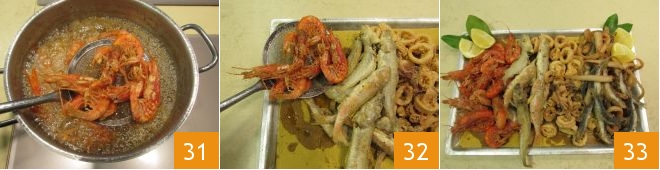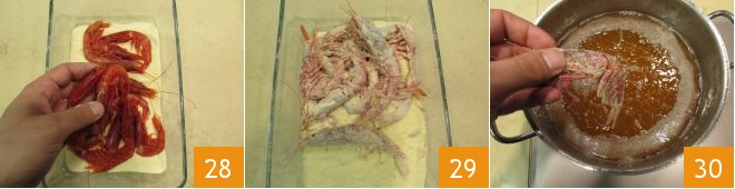 Now move on to the shrimp. Flour them in the semolina (28-29), then dip them in the hot oil 30.