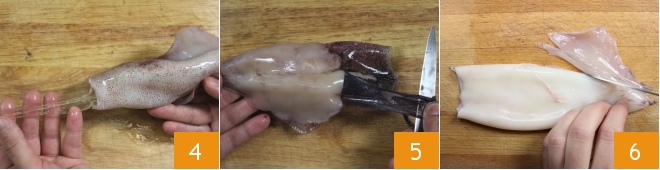 and remove the cuttlebone 4. Wash the mantle under running water and discard the entrails. Make a slight incision and remove the skin using a small knife 5. Wash the calamari again under water, then cut the fins to separate them from the mantle 6