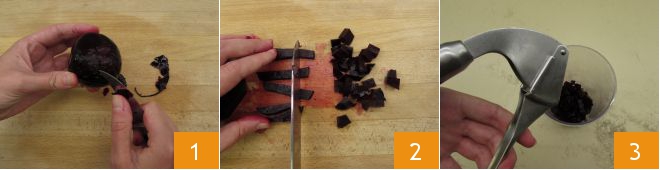 To prepare the fried mushrooms with beetroot mayonnaise, start with the latter. If you don't want to stain your hands, use gloves, then peel the beetroot 1 and cut it first into slices, then into strips, and finally into cubes 2. Put them in the bowl of a mixer along with the peeled ginger root 3,