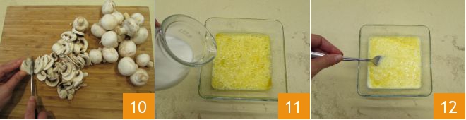 Finally, slice them to a thickness of 1/8 to 3/16 inch 10. Crack the eggs into a bowl, add the milk, a pinch of salt 11, and beat lightly 12.