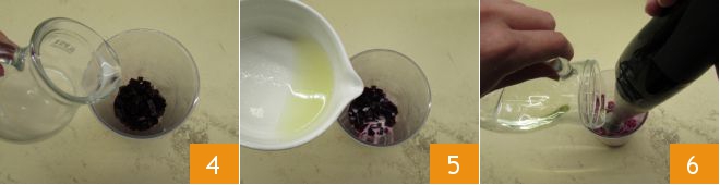 the soy milk 4, the lemon juice 5, and begin to blend while pouring the vegetable oil in a thin stream 6.