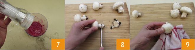 When you have obtained a smooth and fluid sauce, adjust the salt and set aside 7. Move on to the mushrooms. Cut off the earthy part of the stem 8 and to clean them, use a damp cloth, trying to rub off the dirt. It is preferable not to wash the mushrooms because they absorb water 9.