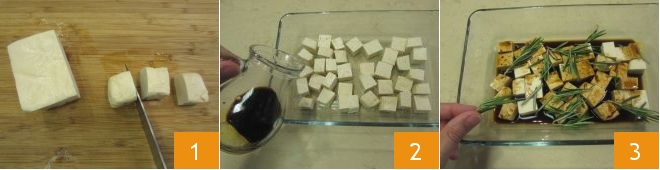 To prepare the fried tofu, first cut the tofu into 1-inch cubes 1. Transfer the cubes to a baking dish and add the soy sauce 2, a few sprigs of rosemary 3