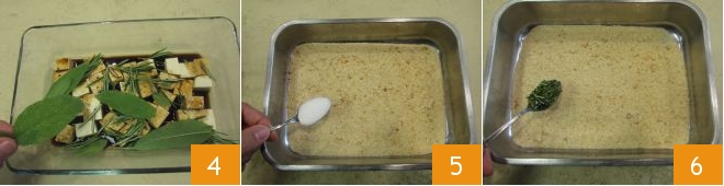 and a few sage leaves 4, then cover with plastic wrap and let marinate while you continue with the rest of the recipe. Now prepare the breading: pour the breadcrumbs into another container, season it with a pinch of salt 5 and a teaspoon of chopped rosemary 6 and mix well.