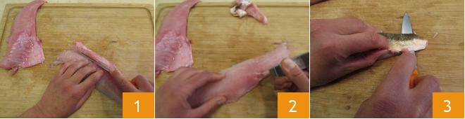 To prepare the fried tub gurnard, start with cleaning the fish fillets. Cut away the dorsal part where the central bone is, then the belly part with bones and cartilage 1. Detach the bones with the appropriate tweezers 2. Flip the fillets and make an incision with a smooth blade knife to facilitate peeling 3,