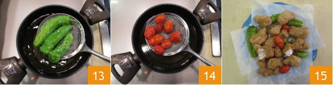 Drain the friggitelli 13 and fry the cherry tomatoes for about 1 minute as well 14. Now that everything is ready, arrange your plate with the fried tub gurnard, friggitelli, and cherry tomatoes, salt to taste and eat immediately 15!