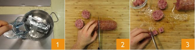 To prepare friselle with lentils and cotechino, start with the latter. Follow the instructions on the package for cooking: ours requires immersion in cold water, and from the boiling point, 20 minutes of boiling 1. Once cooked, drain it, open the package and let the melted gelatin flow inside, being very careful not to burn yourself. Place on a cutting board, slice it 2, then cut into cubes about 0.6 inches and set aside 3.