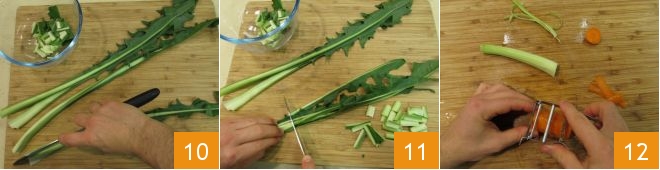 Clean the chicory. After removing the base, split the stems in half following the vertical line 10. Then cut into pieces about 0.8 inches and rinse thoroughly 11. At this point, peel the carrot and the outer part of the celery 12,