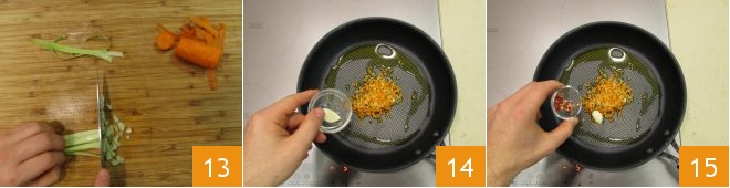 then finely chop the knife 13. Next, remove the top from the chili pepper and finely chop it. Move to the stove. In a large pan, heat a splash of oil along with the chopped carrot and celery, the peeled garlic clove 14, and the chopped chili pepper 15