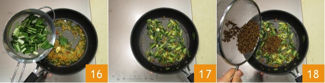 After a few moments, toss in the pieces of chicory and sauté for a few minutes (16-17). Then add the drained lentils and sauté them too for a few minutes 18.