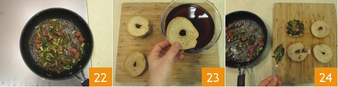 Now that everything is ready, you can proceed with the composition 22. In the container where you poured the lentil cooking liquid, which should still be warm, dip the friselle for a few moments 23. Garnish them first with the mix 34,