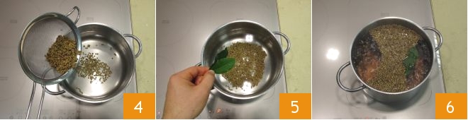 Now take care of the lentils. Rinse them under a stream of fresh water, then plunge them into a pot full of cold water 4. Add the bay leaf 5 and bring to a boil. They will cook in about 25 minutes, remaining nice and crunchy 6.