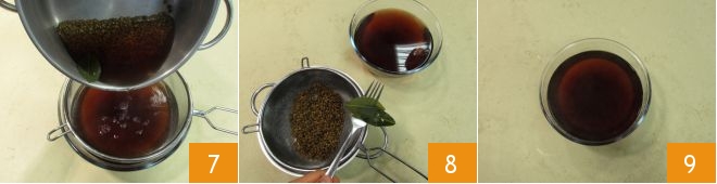 At the end of cooking, drain them in a container with a colander inside 7, discard the bay leaf 8, and keep the cooking water 9.