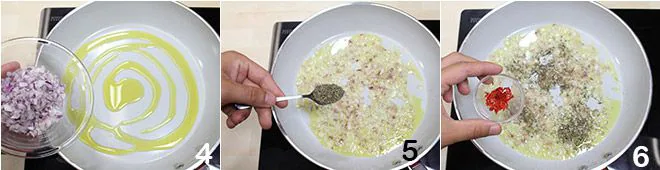 Sauté the onion in three tablespoons of extra virgin olive oil 4 and, when it is golden, add the fennel seeds 5, the chopped chili pepper 6,