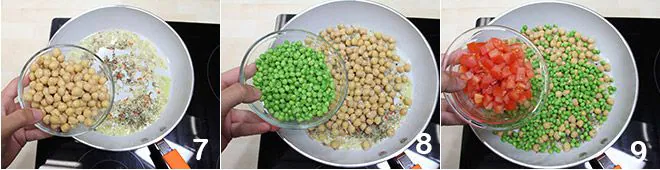 the chickpeas 7, taken out of the can, rinsed with water and drained, the peas, which you will have defrosted in the meantime, 8 and finally the tomato 9. Let everything cook over medium heat for 10 minutes.