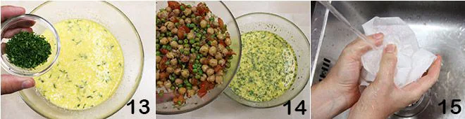 the parsley 13 and mix all the ingredients. When the vegetables are cooked, add them to the egg mixture and mix well 14. Rinse a sheet of parchment paper under running water to make it more malleable 15,