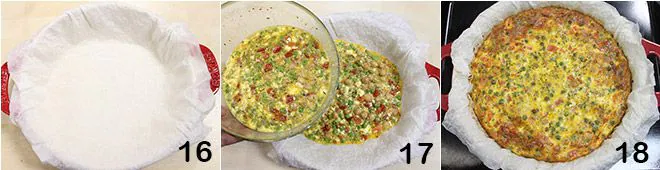 then wring it out well and place it in a baking dish with a diameter of 11 inches 16, pour the egg and vegetable mixture and bake everything at 375°F for 60 minutes in a fan oven 17. The baked chickpea omelette is ready 18, serve it at room temperature, cut into slices or small squares.