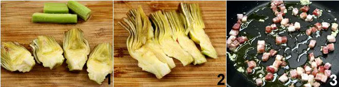 To prepare the artichoke, mushroom, and smoked bacon omelette, start by cleaning the artichokes using the method shown in the cooking school video How to clean artichokes; you should only use the hearts and stalks 1. Clean the mushrooms and cut them into small pieces. Slice the artichoke hearts thinly 2 and cut the stalks into small pieces, then keep them in acidulated water to prevent browning. Heat the oil in a non-stick pan and add the minced garlic clove, fry the garlic and add the diced bacon 3,