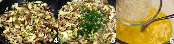 the rinsed and drained artichokes and the chopped mushrooms 4. Sauté everything to flavor, add the chopped parsley 5, and adjust with salt and pepper. Cook for 10 minutes. Meanwhile, in a bowl, beat the 6 eggs with a fork, add the grated Grana Padano cheese 6 and milk, and mix to combine the ingredients.