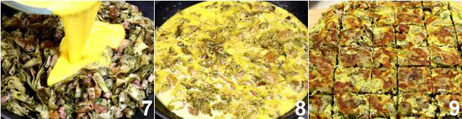 When the vegetables are cooked, pour the mixture into the pan 7, immediately mix to combine the eggs and vegetables 8, and let the omelette set. Turn it over when the bottom is cooked, using a lid, and cook the other side as well. We chose to serve the artichoke, mushroom, and smoked bacon omelette as an appetizer, cutting it into squares 9.
