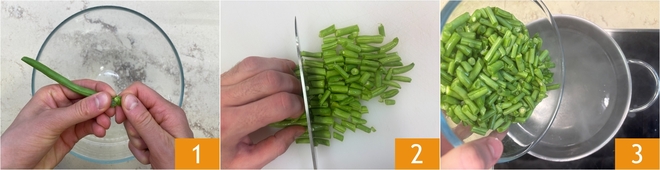 To prepare the frittata with green beans in the air fryer, start by cleaning the green beans: wash them, trim them 1, and cut them into pieces 2. Cook them in plenty of salted boiling water for about 8 minutes 3, then drain and let them cool.