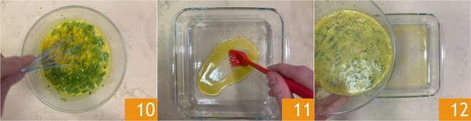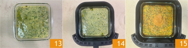 Mix everything well 10. Now take a large baking dish, 22x22 cm (about 8.66x8.66 inches), we used a glass one that fits comfortably inside the air fryer basket, and brush it with a little oil 11. Pour the egg mixture inside 12.