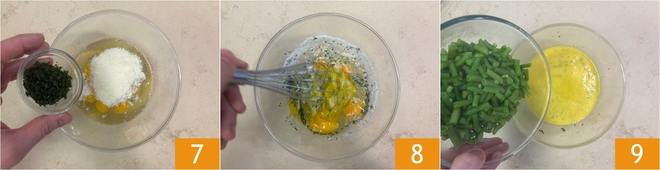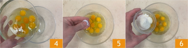 Crack the eggs into a bowl 4, add salt 5, pepper, and grated Parmigiano Reggiano 6.