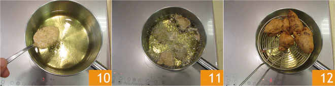 Use two tablespoons to help: with one scoop up the batter and with the other try to give a round shape to the batter before dropping it into the oil heated to 340°F 10. Always be careful not to burn yourself. Fry a few at a time, using two tablespoons to form round fritters. Fry for 2-3 minutes, turning on both sides 11. Drain the fritters when they are golden 12.