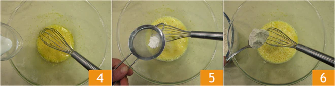 Pour the milk gradually 4 while stirring with a whisk, sift in the baking powder 5, and finally add the chestnut flour little by little while stirring often with a whisk 6.