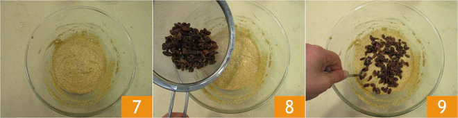 Once the batter is well mixed 7, incorporate the drained and rehydrated raisins 8. Stir one last time 9.