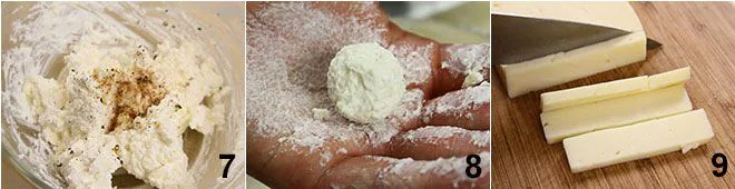 and mix everything 7 to form balls of about 0.5 oz each 8. Finally, slice the remaining provolone 9. Prepare the ingredients for breading: in a bowl, beat the egg yolks with salt, and place flour and breadcrumbs on two large trays.