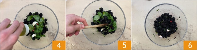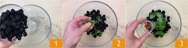 To prepare fusilli with blackberries, start by marinating the blackberries: in a bowl, pour the fruits, then season with fresh oregano, thyme, basil 2, and chopped chili pepper 3.