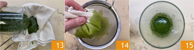 Strain the mixture with a cheesecloth 13 and squeeze well 14. Let the basil-flavored oil rest for 15 minutes 15.