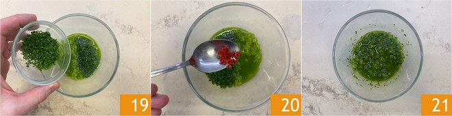 Add chopped chives 19 and chopped chili pepper 20, stir and set aside 21.