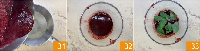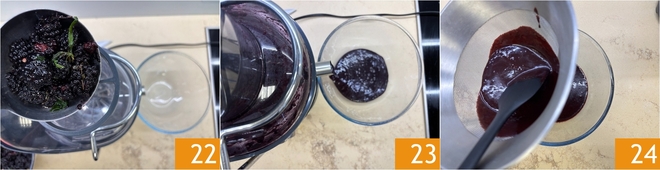 Retrieve the marinated blackberries and pass them through a juicer 22 to obtain a puree 23. Strain the mixture through a strainer 34. You can dry the leftovers in the oven to make a blackberry powder to use as a final garnish.