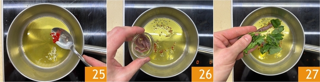 In a saucepan, pour the oil, chopped garlic, and chopped chili pepper 25, sauté for a couple of minutes, then season with anchovies (or a dried agone head), basil, and parsley.