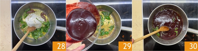 Sauté for another couple of minutes 28, then pour in the blackberry sauce 29 and stir. Cook for an hour over low heat 30. Salt at the end of cooking.