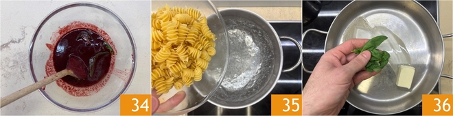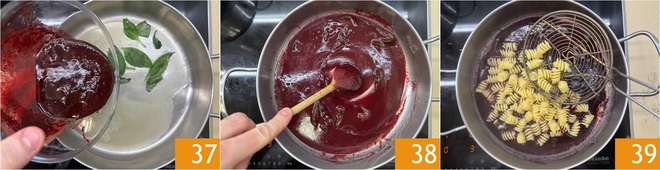 Pour the blackberry sauce 37, mix, and after 6 minutes, drain the pasta here 39.