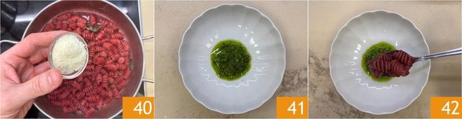 Finish cooking and toss off the heat with the grated cheese 40. Everything is ready to plate: at the base, pour a spoonful of chimichurri 41, then add the pasta 42.