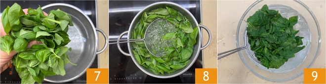 To make the flavored oil, blanch the basil in lightly salted water 7 for a minute, then drain it 8 in ice water 9 to cool and maintain its vibrant color.