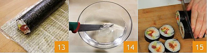 Here is the futomaki ready 11: push inward the protruding rice grains on the sides. Now, cut the futomaki: place it on a cutting board and wet the knife blade with acidulated water 14; cut it in half, place the two obtained pieces side by side, then cut them into six equal parts 15, so you will get 12 pieces of futomaki.