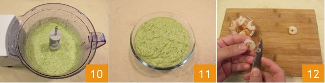 Blend everything until you get a creamy texture 10, add a pinch of salt, and set aside 11. Move on to the shrimps: first, cut along the back with a knife for the entire length and, with the tip, remove the intestine 12.