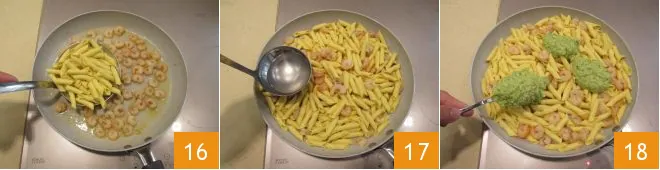 Transfer the garganelli to the pan where you cooked the shrimps 16. Cook together for a minute, add a ladle of cooking water 17, and finally, off the heat, add the zucchini pesto 18.
