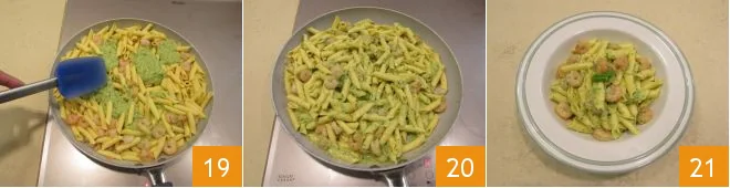Mix everything well 19 to combine the pasta with the sauce 20: your garganelli with zucchini pesto and shrimps are ready to be served 21!