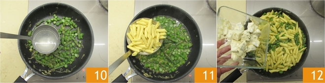 Add a ladle of pasta water to the asparagus 10, drain the garganelli into the pan 11, and finish cooking. Turn off the heat and add the gorgonzola 12.