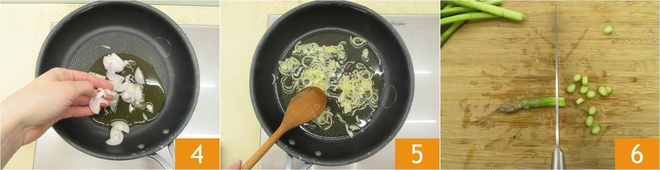 Add the shallot 4 and let it soften 5. Slice the asparagus into rounds 6.