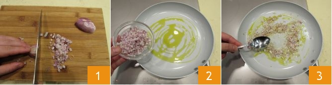 To prepare garganelli with cream, ham, and peas, start by finely chopping a shallot 1. Now take a non-stick pan and pour in a drizzle of olive oil. Add the finely chopped shallot and let it soften over low heat 2. Stir the shallot occasionally to ensure it softens evenly 3.