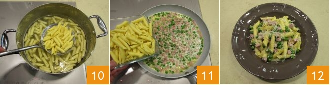 The garganelli will now be ready. Drain them 10 and add them to the pan with the sauce you prepared 11. Toss them with the sauce and mix well so that the garganelli integrate with the sauce. Serve your garganelli with cream, ham, and peas while hot 12, sprinkle with Grana Padano PDO, and... enjoy!