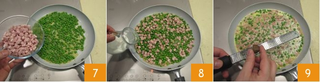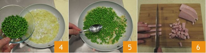 Once the shallot has softened and turned golden, add the peas to the pan 4. In the meantime, boil plenty of water for the pasta in a pot and salt it. When the water returns to a boil, add the pasta. Continue cooking the peas by adding a tablespoon or ladle of cooking water 5 as needed. Season with salt and pepper. Next, proceed with the ham. Cut it into strips and then into cubes 6.