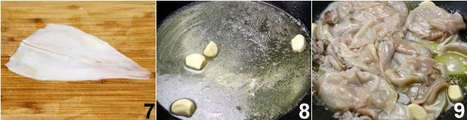 to obtain fillets 7 that will curl during cooking. Place the butter in a large pan with the oil, and once melted, add the garlic 8 and squid, frying them for a few minutes 9.